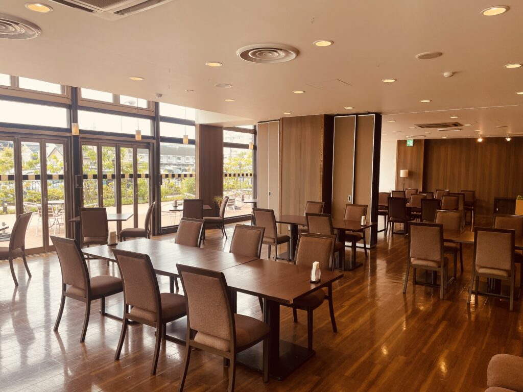 レストランは明るく清潔で、団体対応のテーブルレイアウトが可能です。